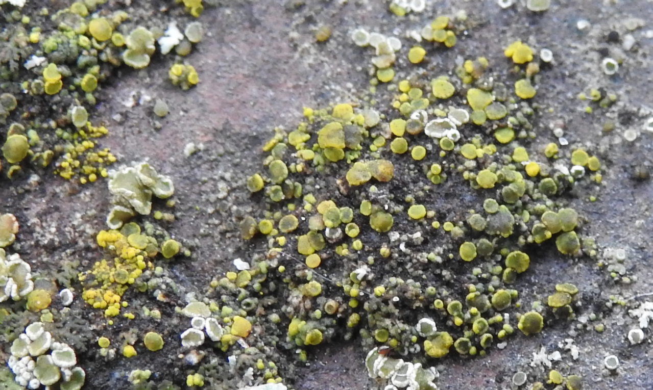 Lichen crustacé à thalle peu développé formé de granules épars (jaune moutarde) sur un hypothalle gris foncé à noir, apothécies fréquentes jaune pâle à jaune sale, 0,2 à 1,2 mm de diamètre, avec un rebord disparaissant à la fin. Sur substrat divers mais surtout calcaire, confusion avec C. vitellina sur roche siliceuse.